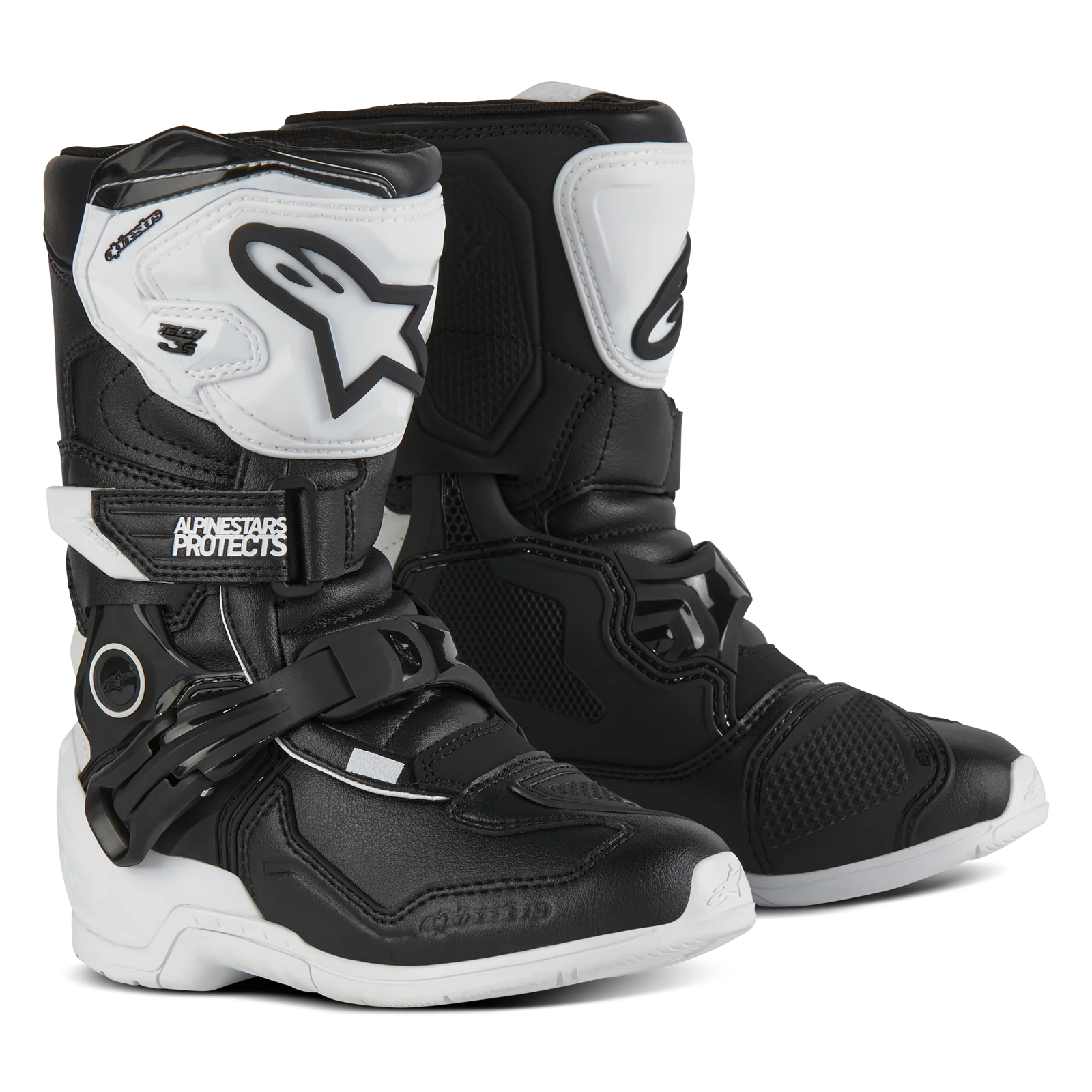 Black and white motocross boots with Alpinestars branding on a white background